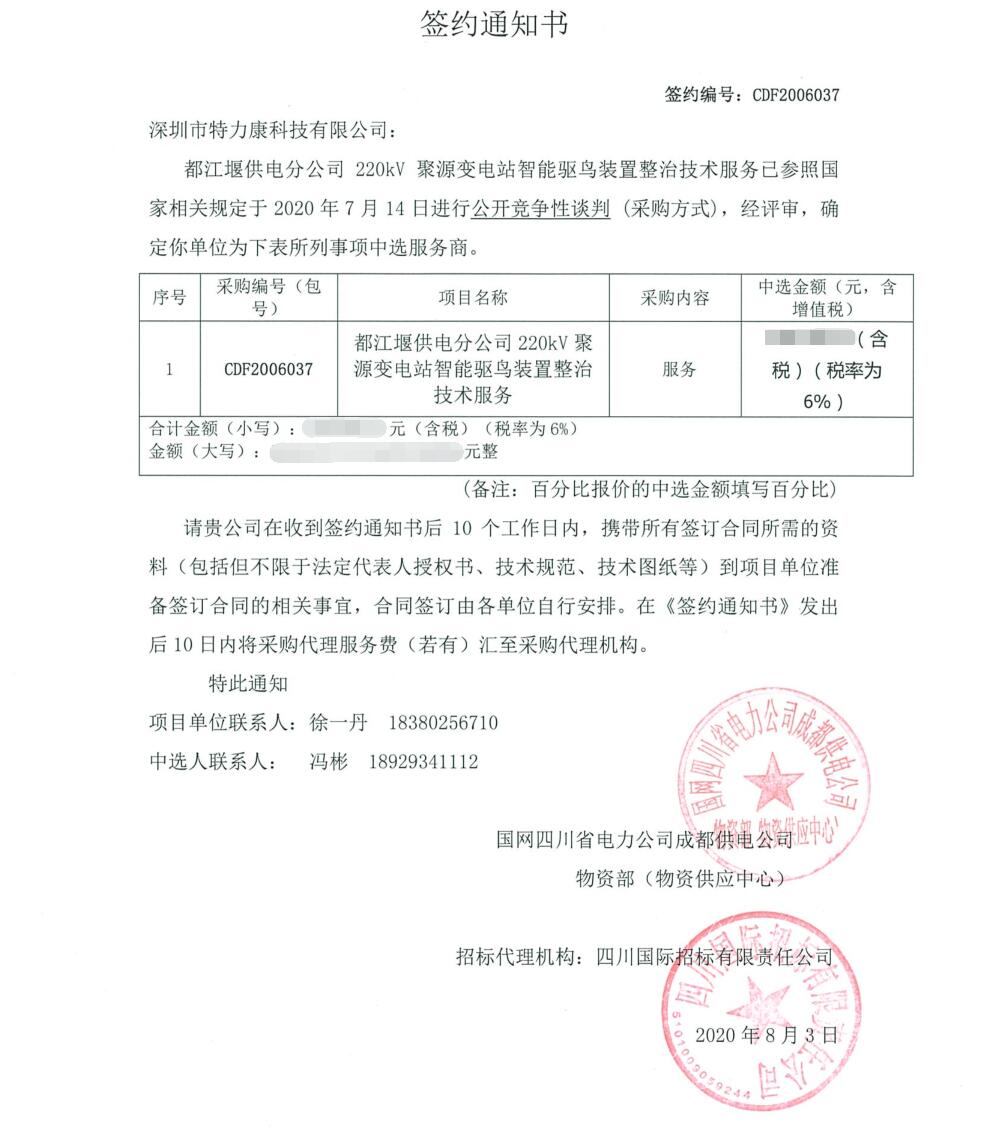 2020年7月14日我司(深圳市特力康科技有限公司)參加的都江堰供電分公司220kV聚源變電站智能驅鳥裝置整治技術服務,已參照國家相關規定進行公開競爭性談判(采購方式),后經專家評審,確定我司為都江堰供電分公司220kV聚源變電站智能驅鳥裝置整治技術服務中選服務商。特發簽約通知書如下: