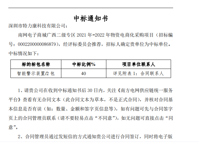 我司中標南網電子商城廣西二級專區(qū)2021年-2022年物資電商化采購項目(招標編號: 0020000086879) - 智能警示裝置,經評標委員會推薦,招標人確定我單位為中標單位。中標情況如下: