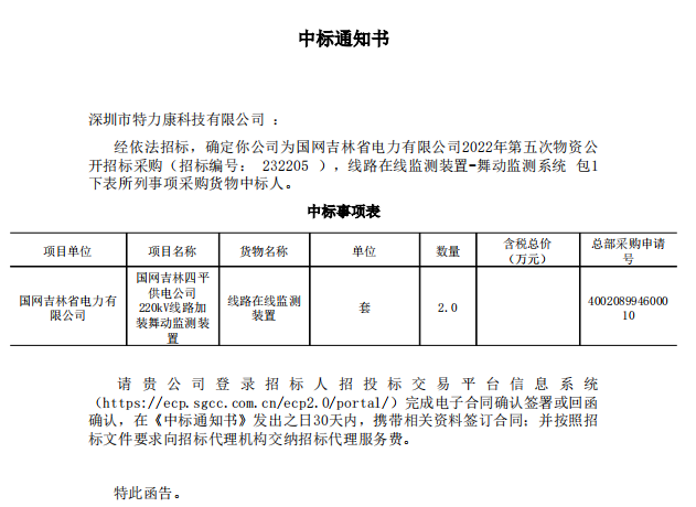 經依法招標,確定我司(深圳特力康)為國網吉林省電力有限公司2022年第五次物資公開招標采購(招標編號: 232205 ),線路在線監測裝置-舞動監測系統包1下表所列事項采購貨物中標人。中標通知如下: